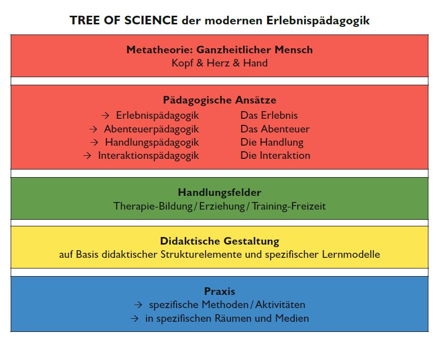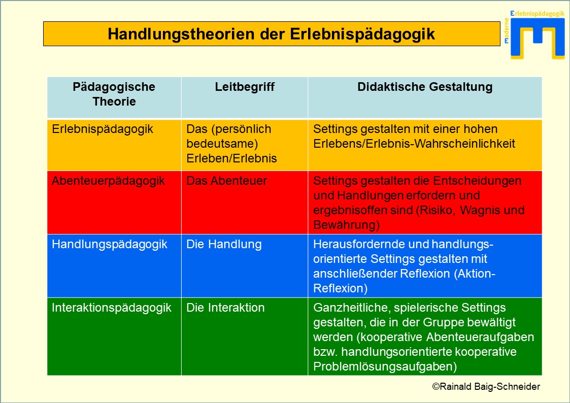 Das Heinrich Pestalozzi zugeschriebene Motte "mit Kopf, Herz und Hand" stellt heute wohl den kleinsten gemeinsamen Nenner dar, wie z.B. das Logo des größten regelmäßig stattfindenden Erlebnispädagogik-Kongresses demonstriert.
